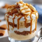 A creamy, layered dessert that combines smooth vanilla pudding, whipped cream, sweet bananas, crunchy Biscoff cookies, and rich caramel.