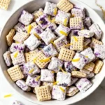 This puppy chow brings the bright flavors of lemon and blueberry to a classic snack mix. It’s quick to make and perfect for parties, school snack packs, or a sweet movie-night treat. The white chocolate gives a creamy cheesecake feel. Lemon juice and zest add zippy brightness. Blueberries give pops of fruity sweetness and a fresh color contrast. The texture is crunchy from the cereal and soft where the chocolate coats it. It’s kid-friendly and easy to customize.