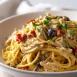 A hearty, comforting meal featuring chicken, pasta, and creamy sauce, all slow-cooked to perfection in your crockpot.