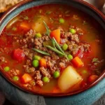 A cozy and satisfying soup made with browned beef, sweet vegetables, and tangy tomatoes, perfect for weeknight meals.