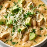 A warm and comforting creamy white chicken chili with tender shredded chicken, soft white beans, and rich, velvety broth.