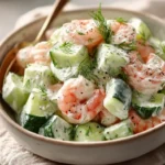 Cucumber Shrimp Salad is a fresh, bright dish that comes together fast. Crisp cucumber and sharp red onion pair with tender shrimp and a creamy lemon-dill dressing. It tastes light, slightly tangy, and very refreshing. This salad works as a quick lunch, a picnic dish, or a light weeknight dinner.