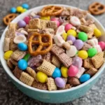 A sweet, colorful snack mix combining popcorn, pretzels, M&M’s, marshmallows, and white chocolate—perfect for parties or Easter baskets.
