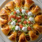 This Easy Cheesy Beef Taco Ring is a crowd-pleaser. A buttery crescent roll crust holds seasoned ground beef, melty cheese, bright tomatoes, and onions. It bakes to a golden brown and smells warm, savory, and irresistible. Slice it like a pie and serve with sour cream, salsa, and crisp lettuce for a fun, shareable meal.