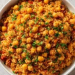 This one-pot Moroccan couscous with chickpeas is warm, fast, and full of fragrant spices. Toasted cumin and coriander lift the savory tomatoes and chickpeas, while a touch of cinnamon and sweet raisins add Moroccan flair. It’s fluffy, slightly sweet, and bright with fresh herbs — a comforting weeknight meal that comes together in under 30 minutes.