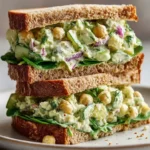 You’ll mash chickpeas and mix them with Greek yogurt (or vegan mayo) and green goddess dressing. Then fold in crisp cucumber, celery, scallions, and herbs. Season, spread on bread, and add lettuce. Toast the bread if you like a little crunch. The result is creamy, herb-forward, and slightly tangy with fresh crunch.