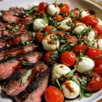 This dish combines the best of a classic Caprese salad with the bold flavor of grilled flank steak. You get a contrast of textures: crisped, charred edges on the steak and soft, milky mozzarella. The tomatoes pop with juice and the basil releases a fresh aroma. It cooks quickly, which makes it ideal for busy nights. The bright balsamic and olive oil dressing ties everything together with a tangy, silky finish.