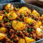 A warm, savory skillet dish featuring tender ground beef and diced potatoes, seasoned with aromatic onion and garlic for a comforting meal.