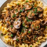 Serve hot over egg noodles, spaghetti, or brown rice. Spoon the creamy stroganoff over a bed of mashed potatoes for a rustic meal. Add a side of steamed greens or a crisp salad to balance the richness. Finish with fresh herbs (parsley or chives) and a lemon wedge for a bright lift.