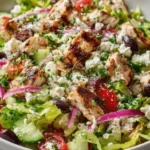 A bright, crunchy salad full of savory Mediterranean flavors, featuring tender chicken, crisp vegetables, and tangy feta.