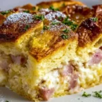 Delicious Monte Cristo Breakfast Casserole with ham, cheese, and eggs