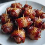 These savory brown sugar beef bacon little smokies are sticky, smoky, and perfectly caramelized. Crispy bacon wraps juicy beef smokies while a sweet brown sugar and BBQ glaze forms a glossy, slightly sticky coating. They smell like comfort and party food combined. They take little hands-on time and always disappear fast at gatherings.