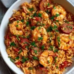 A bold and smoky one-pot dish featuring spicy sausage, savory chicken, and juicy shrimp mixed with rice and Cajun spices.