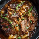 A hearty pot roast featuring the rich flavors of caramelized onions and savory broth, perfect for family gatherings.